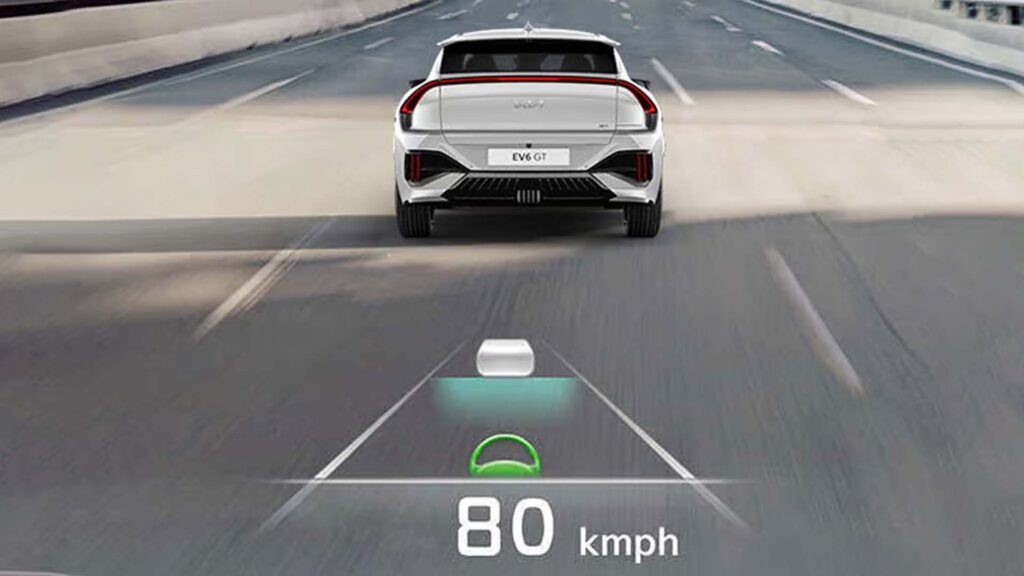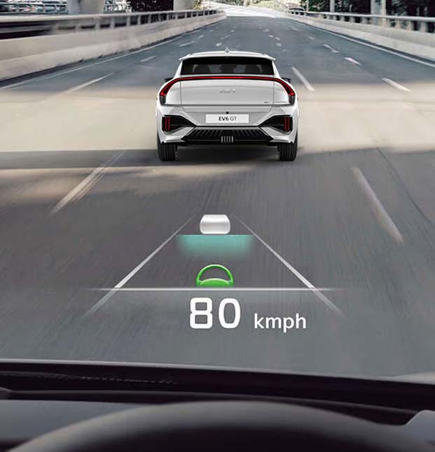 Key information such as speed, and lane safety indication, is projected in an intuitive manner on the windscreen